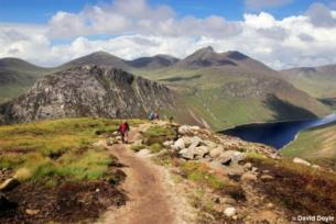 This fantastic circular walking route follows the Mourne Wall to the summit of Slieve Binnian (747m), traverses between the spectacular South and North Tors before descending along a track past the Blue Lough, Annalong Forest and back to the car park.