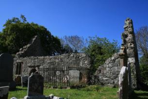 Ruins of a 15th century church with 17th century additions. Simple gabled building within ...