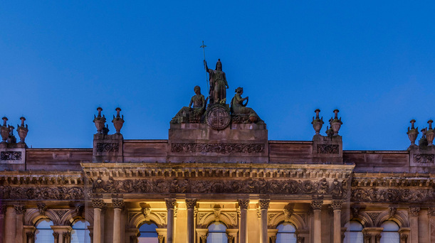 A statue stands before the grand domes and ornate façade of Belfast City Hall under a clear evening sky. A statue stands before the grand domes and ornate façade of Belfast City Hall under a clear evening sky.